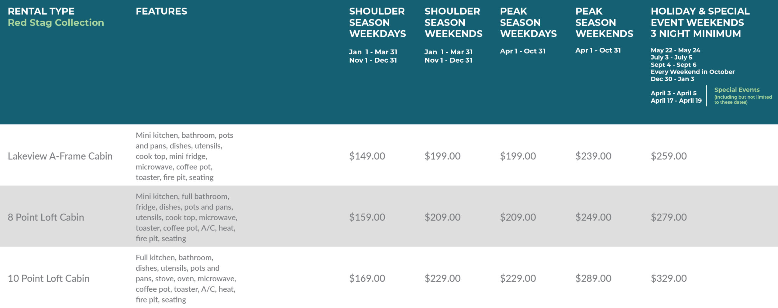 All reservations require a 50% deposit at time of booking with the remaining balance due 30 days prior to arrival which we will take automatically with the credit card on file. Special or promotional offers are only valid on non-holiday or special event weekends and cannot be combined with any other offers.